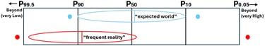 Reality, however, may be quite different. It can be observed that (a) projects tend to cluster somewhat below the P50 outcome, with (b) a further skew towards the lower quartile, and (c) only a very small number of projects being significantly better than the P50. Finally, of the projects that fall outside the range, the vast majority are below P90. Extreme outcomes are possible on either side.